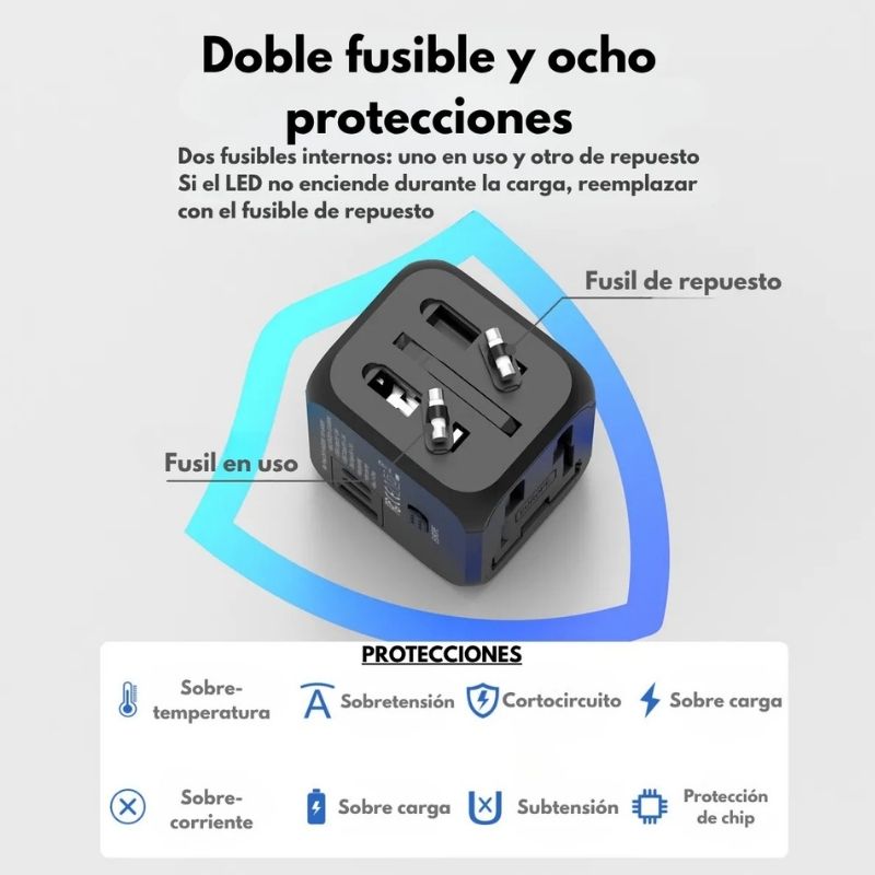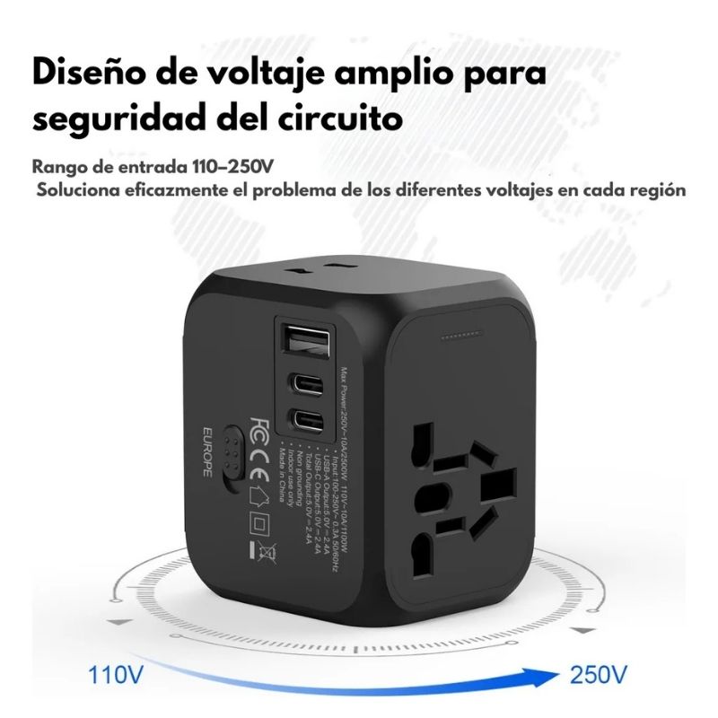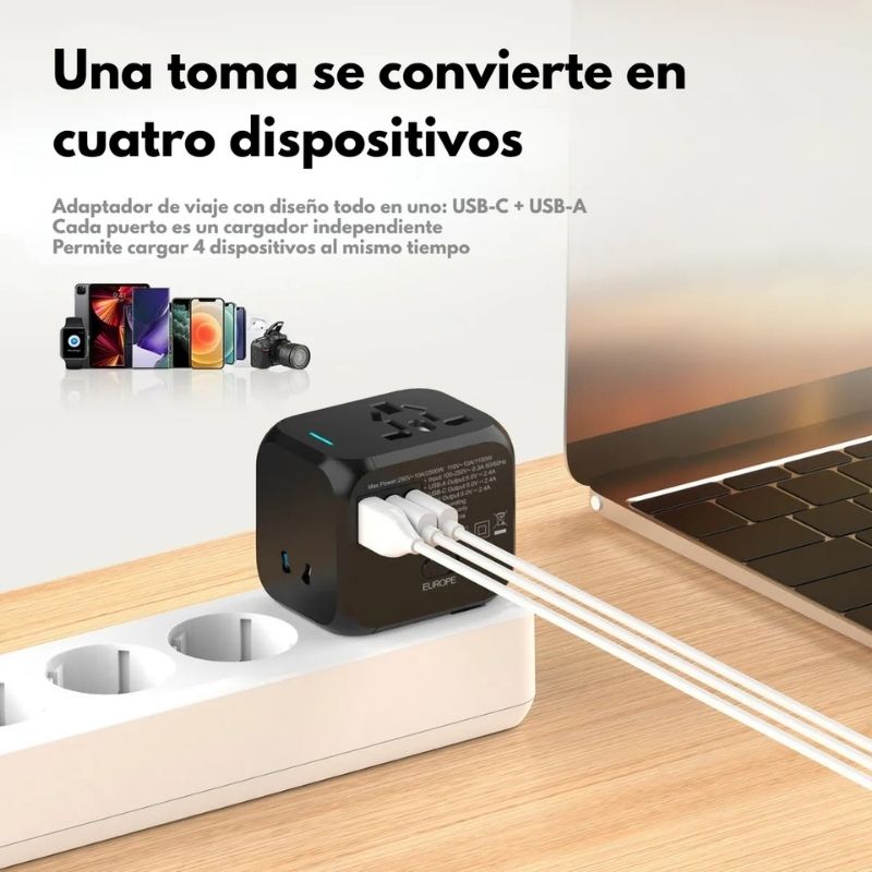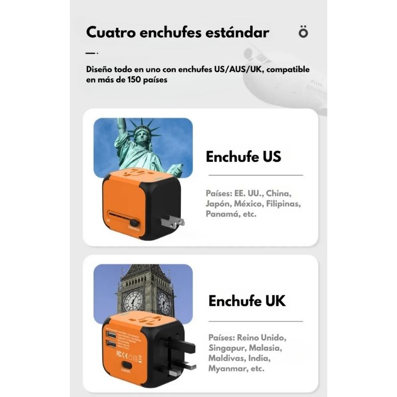 Diseñado para funcionar en EE.UU., Reino Unido, Europa y Australia, este adaptador cubre más de 150 países, evitando la necesidad de llevar múltiples modelos.